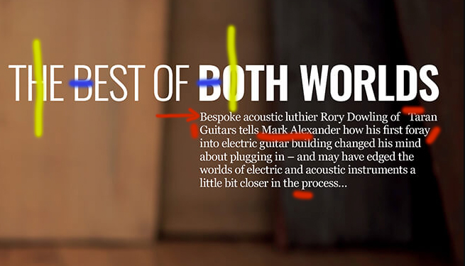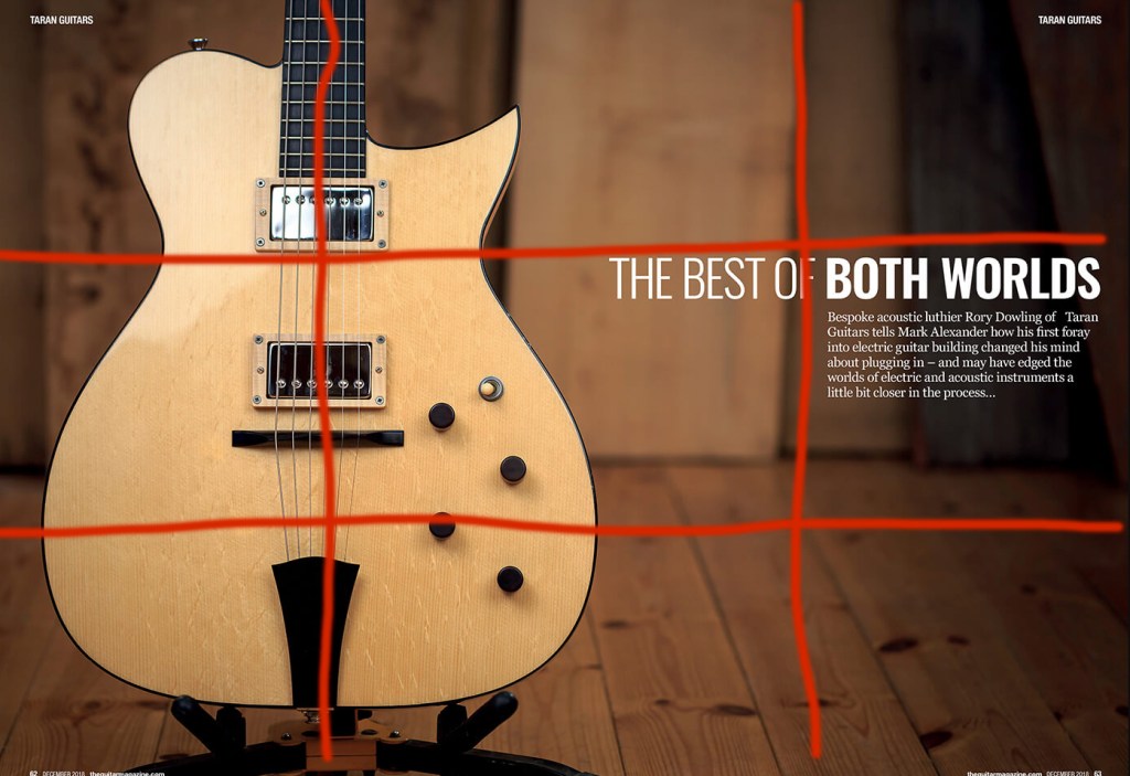 I mimicked the original photograph by selecting three types of guitars and placing them against a hardwood background similar to the background in the original picture. I attempted to create the same lighting affect as well. I also used the Rule of Thirds technique featured in the original photograph. The original picture talked about the contrasting of acoustic versus electric guitars. My photographs would work well in that same spread because I have selected a guitar that has not been luthiered yet, an acoustic guitar and an electric guitar. These depict different and contrasting types of guitar levels, sizes, colors and sounds.